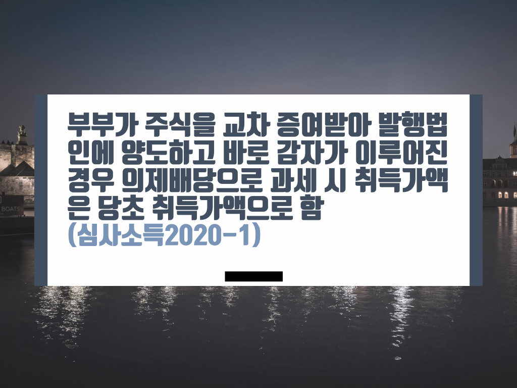 [제목] 부부가 주식을 교차 증여받아 발행법인에 양도하고 바로 감자가 이루어진 경우 의제배당으로 과세 시 취득가액은 당초 취득가액으로 함