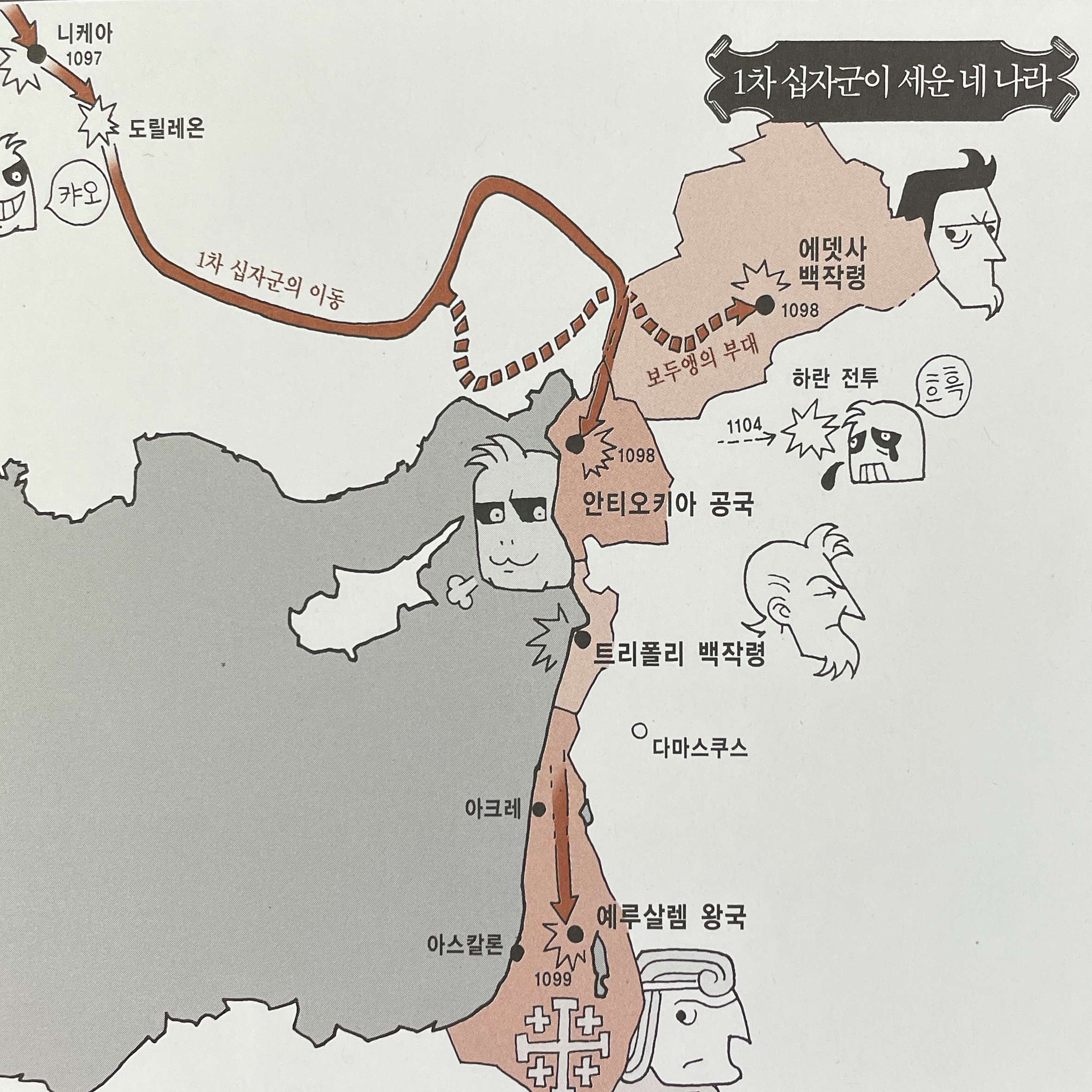 1098년 에뎃사에 백작령 설치. 알렉시오스 1세와의 협약이 깨어지다. 안티오키아와 마라트안누만의 학살. 보에몽이 안티오키아를 무단으로 점거하고 공국을 설치하다.
