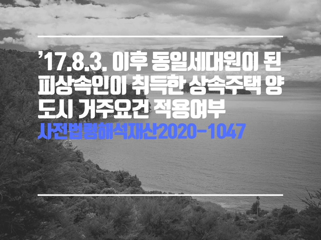 - ‘17. 8. 2. 이전 피상속인이 쟁점주택을 취득한 경우로서‘17.8.2. 후에 피상속인과 상속인(子)이 동일세대원이 되어 상속 개시일에 피상속인과 동일 세대원이었던 상속인(子)이 ’17.9.19. 이후 쟁점주택을 양도하는 경우에 1세대 1주택 비과세 특례를 적용받기 위하여 거주기간 요건을 충족해야 하는지 여부