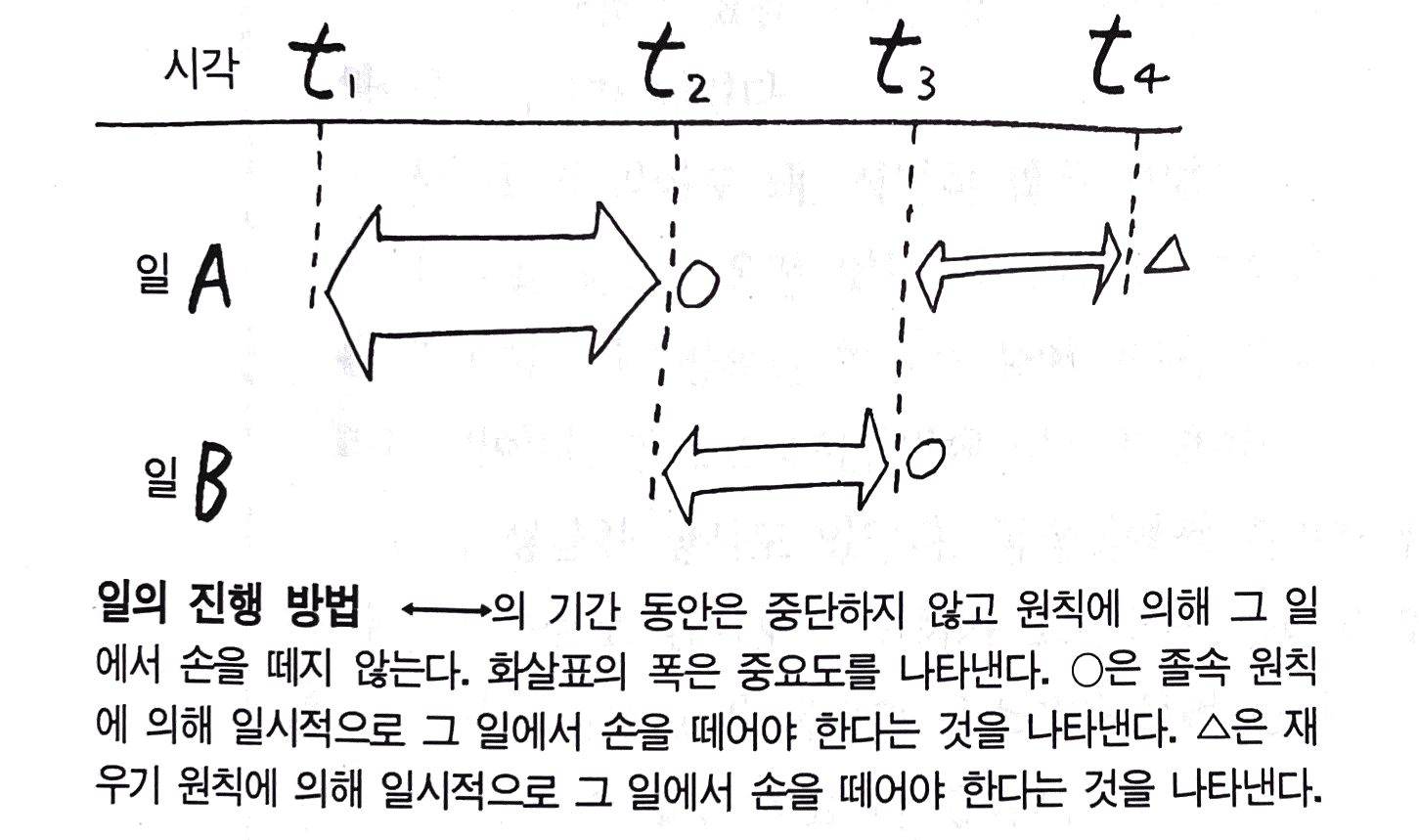 두 가지 일 A, B 가 있는 경우에 대해서 위에서 열거한 원칙에 따르는 일의 진행 방법을 그림으로 예시했다. 우선 가장 중요한 안건 A를 t1에서 t2까지 중단하지 않고 일단 마무리 짓는다. 다음에 「졸속 원칙」에 따라서 일 A에서 손을 떼고 두번째로 중요한 안건 B를 t3까지 마무리 짓는다. 다음에 다시 A를 t4까지의 시간을 들여서 좀 더 완성도를 높인다.