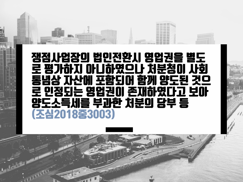 [제목] 쟁점사업장의 법인전환시 영업권을 별도로 평가하지 아니하였으나 처분청이 사회통념상 자산에 포함되어 함께 양도된 것으로 인정되는 영업권이 존재하였다고 보아 양도소득세를 부과한 처분의 당부 등