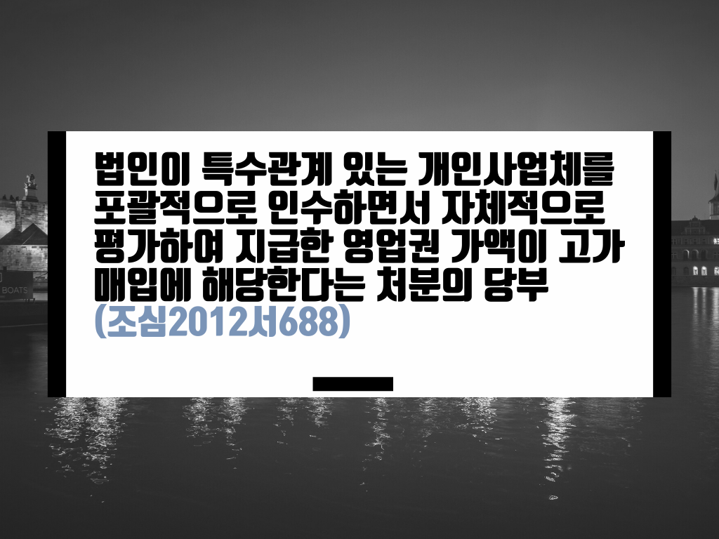 [제목] 법인이 특수관계 있는 개인사업체를 포괄적으로 인수하면서 자체적으로 평가하여 지급한 영업권 가액이 고가매입에 해당한다는 처분의 당부