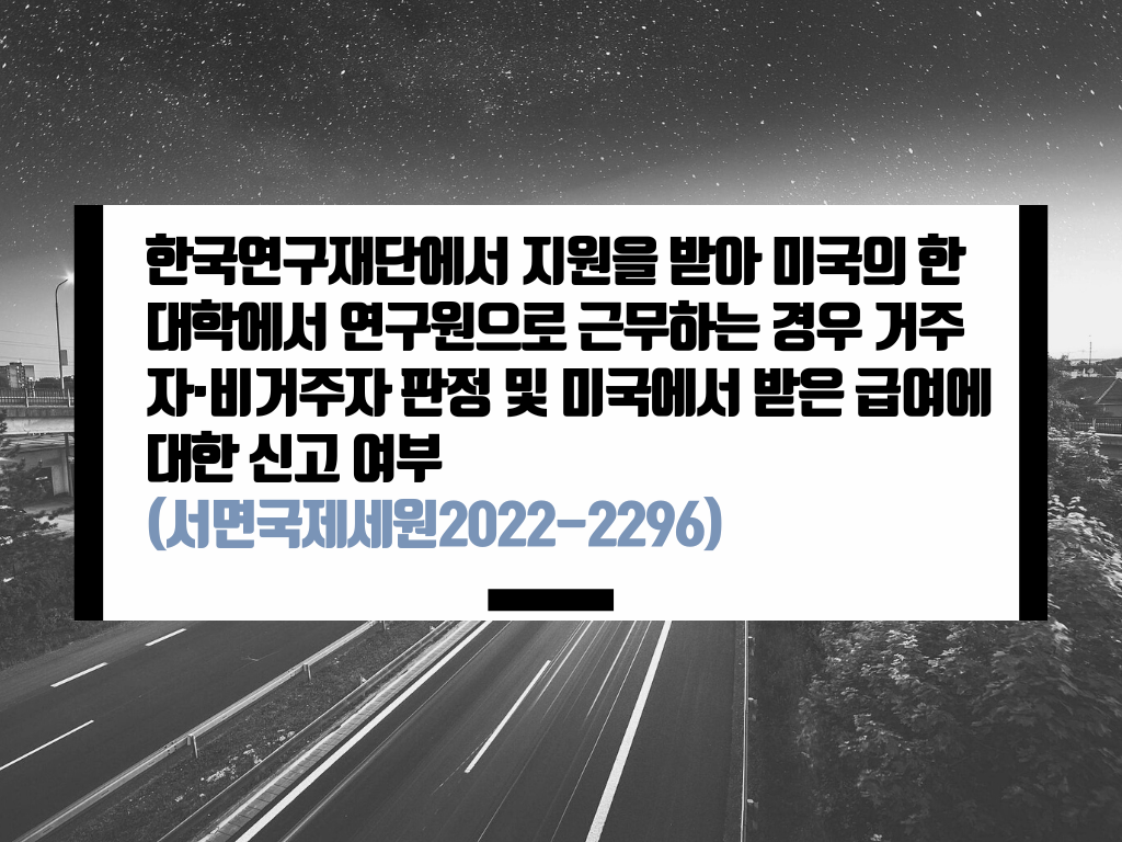 [제목] 한국연구재단에서 지원을 받아 미국의 한 대학에서 연구원으로 근무하는 경우 거주자·비거주자 판정 및 미국에서 받은 급여에 대한 신고 여부