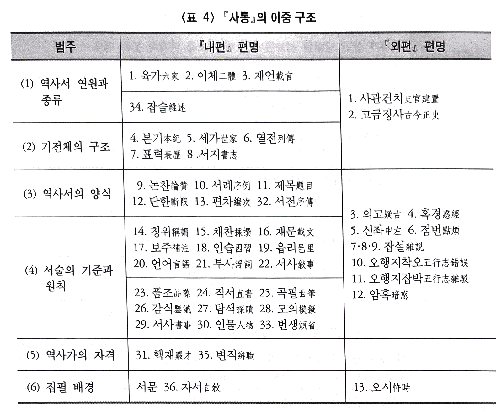 《사통史通》의 구조는 형식적으로는 내편과 외편으로 되어 있다. 우리가 사통 자체를 연구하는 것은 아니고, 사통을 읽으면서 역사 공부할 때 어떤 것들을 유념해야 할 것인가에 관한 일종의 공부의 지침을 얻기 위한 것이니까, 본격적으로 이 문헌을 연구하는 사람들 처렁 깊이 있게 들어갈 필요는 없겠다. 오항년 교수가 사통의 구조와 역사 비평이라고 하는 읽기에 앞서 적어놓은 게 있다. 거기에 보면 고병익 교수의 분류가 있고, 조여보의 분류가 있는데 그런 것들을 바탕으로 해서 사통의 이중 구조라는 항목 표를 만들어 둔 게 있다. 이걸 가지고 이야기를 해보겠다. 고병익 교수의 분류나 조여보의 분류나 이런 것들이 어떤 차이가 있는가. 전문적인 문헌 연구가 아니기 때문에 이제 오항년 교수의 분류를 보겠다.