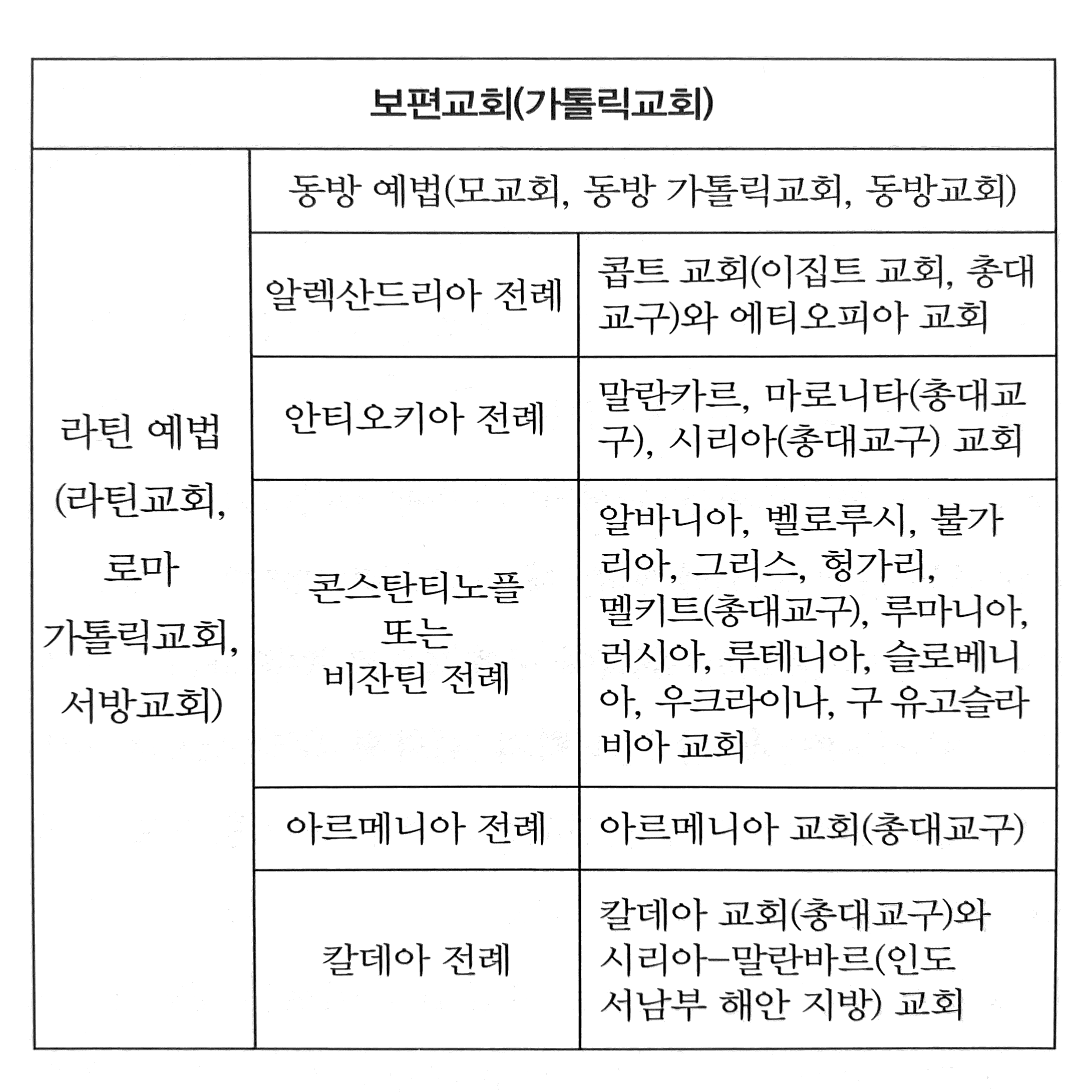 13 한국 사회에서 동방교회라고 하면 대부분 동방정교회를 떠올린다. 그러나 로마 가톨릭교회 안에는 라틴 예법의 로마 가톨릭교회와 다양한 동방 예법으로 구성된 동방 가톨릭교회가 존재한다. 이 두 교회는 베드로의 후계자이자 보편교회의 수위권과 주교단의 으뜸이며, 그리스도의 대리이자 세상 보편교회의 목자인 교황과 온전히 일치해 있다.