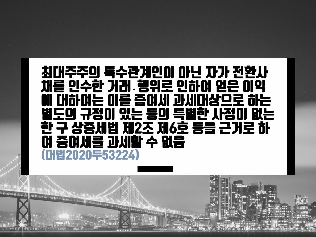2) 구 상증세법 제40조 제1항은 “전환사채, 신주인수권부사채(신주인수권증권이 분리 된 경우에는 신주인수권증권을 말한다) 또는 그 밖의 주식으로 전환·교환하거나, 주식 을 인수할 수 있는 권리가 부여된 사채(이하 ‘전환사채 등’이라고 한다)를 인수·취 득·양도하거나, 전환사채 등에 의하여 주식으로의 전환·교환 또는 주식의 인수(이하 ’주식전환 등‘이라고 한다)를 함으로써 다음 각 호의 어느 하나에 해당하는 이익을 얻 은 경우에는 그 이익에 상당하는 금액을 그 이익을 얻은 자의 증여재산가액으로 한 다.”라고 규정하고 있고, 제2호 다목(이하 ’이 사건 조항‘이라고 한다)은 ’전환사채 등을 발행한 법인의 최대주주의 특수관계인(그 법인의 주주는 제외한다)이 그 법인으로부터 전환사채 등을 인수·취득한 경우로서, 전환사채 등에 의하여 주식전환 등을 함으로써 교부받았거나 교부받을 주식의 가액이 전환가액 등을 초과함으로써 얻은 이익‘을 증여세 과세대상으로 규정하고 있다. 즉, 이 사건 조항은 전환사채 등의 주식전환 등에 따른 모든 이익을 증여세 과세대상으로 규율한 것이 아니라, 전환사채 등을 인수·취득한 자가 발행 법인 최대주주의 특수관계인으로서 발행 법인의 주주가 아닐 것을 요구하는 등 과세대상과 과세범위를 한정함으로써 증여세 과세의 범위와 한계를 설정한 것으로 보아야 한다. 따라서 이 사건 조항의 과세대상이나 과세범위에서 제외된 거래·행위, 즉 이 사건에서와 같이 발행 법인 최대주주의 특수관계인이 아닌 자가 전환사채를 인 수한 거래·행위로 인하여 얻은 이익에 대하여는 이를 증여세 과세대상으로 하는 별도의 규정이 있는 등의 특별한 사정이 없는 한 구 상증세법 제2조 제6호 등을 근거로 하 여 증여세를 과세할 수 없다.