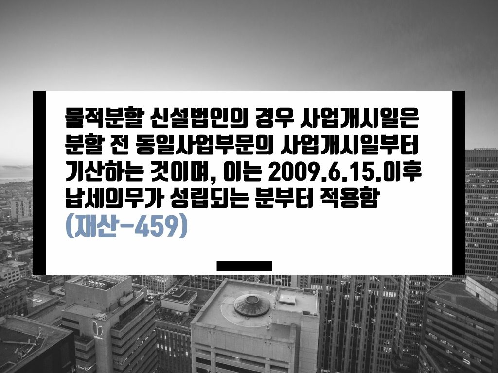 [요약] 물적분할 신설법인의 경우 사업개시일은 분할 전 동일사업부문의 사업개시일부터 기산하는 것이며, 이는 2009.6.15.이후 납세의무가 성립되는 분부터 적용함