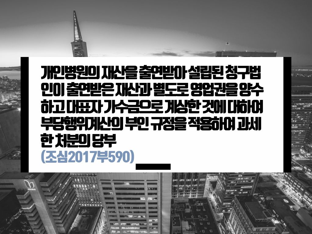 [제목] 개인병원의 재산을 출연받아 설립된 청구법인이 출연받은 재산과 별도로 영업권을 양수하고 대표자 가수금으로 계상한 것에 대하여 부당행위계산의 부인 규정을 적용하여 과세한 처분의 당부